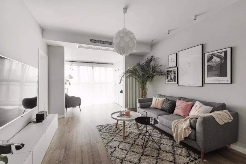 客廳整體色彩飽和度都非常低,偏柔和,沙發(fā)背景墻是淺灰色乳膠漆,搭配深灰色亞麻沙發(fā),層次感立馬就能展現(xiàn)出來,宜家爆款圓形小茶幾搭配肌理分明的淺木色地板,給人非常溫暖舒適的感覺。