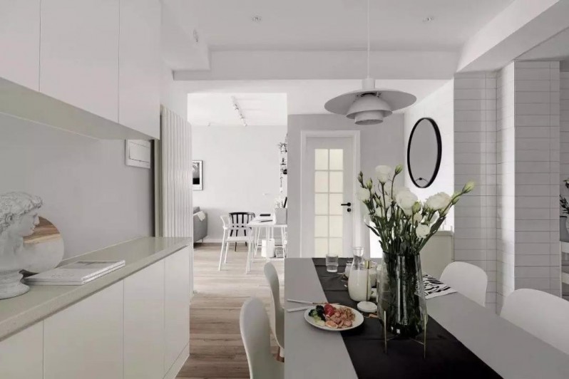 戶型屬于開門見廳的格局,隱私相對比較差,但是面對的是餐廳,卻可以讓下班后到家的人一眼就看到餐桌上精致可口的飯菜和親切溫暖的居家氛圍,反而成就了一種幸福,玄關(guān)柜側(cè)立,頂天立地款式,同時(shí)充當(dāng)著餐邊柜的作用,白色餐桌素雅的插花,簡單大方,北歐風(fēng)情的吊燈,讓餐廳籠罩在一片暖意中。