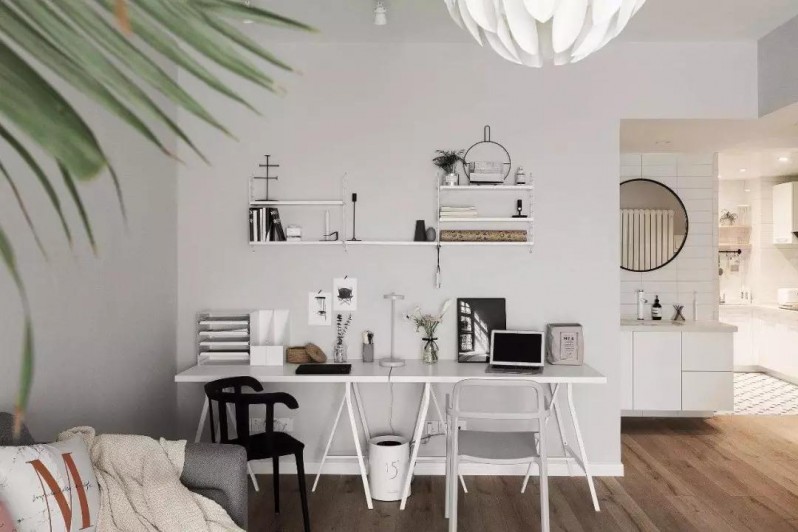 餐廳稍微轉(zhuǎn)角一下,就是開放式書房和客廳,白色書桌特意做成1.5米的,小夫妻都喜歡看書,男主人也經(jīng)常在家還需要辦公,因而,有一個(gè)寬敞的空間是小夫妻都強(qiáng)烈要求的,書桌和墻上的置物架都非常的簡易,勾勒出時(shí)尚的線條美。