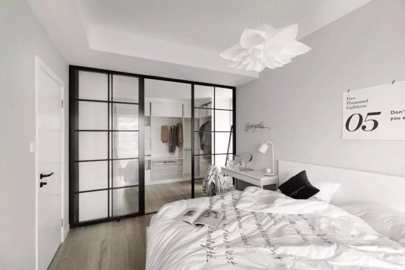 淺灰色墻面搭配白色時(shí)尚輕柔的床品,分分鐘讓人沉浸在睡夢中,無法自拔。黑色玻璃推拉門內(nèi)隱藏著一間衣帽間。