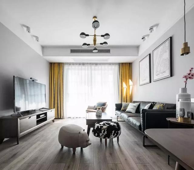 金色燈具和黃色窗簾的點(diǎn)綴,讓空間的節(jié)奏更有韻律。