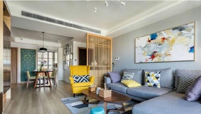 L型灰色布藝沙發(fā)與檸檬黃沙發(fā)椅相組合,搭配原木茶幾和抽象裝飾畫的點(diǎn)綴,舒適又個(gè)性;電視墻的設(shè)計(jì)也很自然風(fēng),電視柜旁邊的北歐綠植更是為空間增色不少。