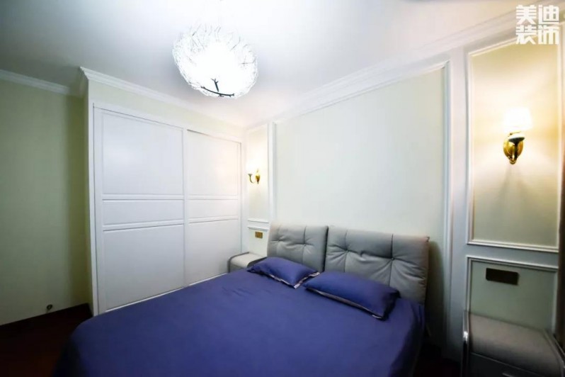 主臥風格簡單大氣,床頭背景墻選用淺綠色,突顯了空間的活潑生動。羽毛吊燈點亮了整個臥室,家里的燈具都是選用變色燈,在明亮和溫暖中可以隨意選擇。