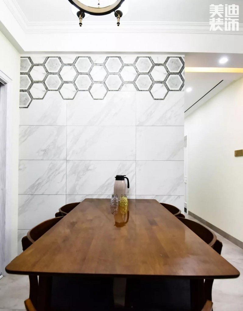 餐桌采用原木色,木材自然的顏色讓空間氛圍舒適清新。大理石墻壁獨特的天然紋理,也自帶裝飾效果。