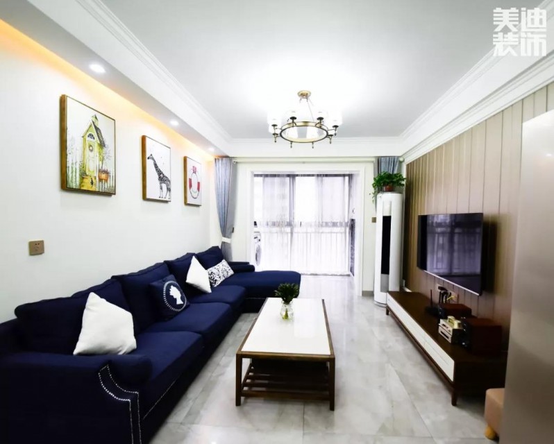 客廳的設計采用的是小美風,硬朗的線條配上雅致的軟裝,將小美風格體現(xiàn)得淋漓盡致。舒適的布藝沙發(fā),深藍色搭配明亮的白色,在裝飾的變化中,家居的層次就體現(xiàn)出來了。