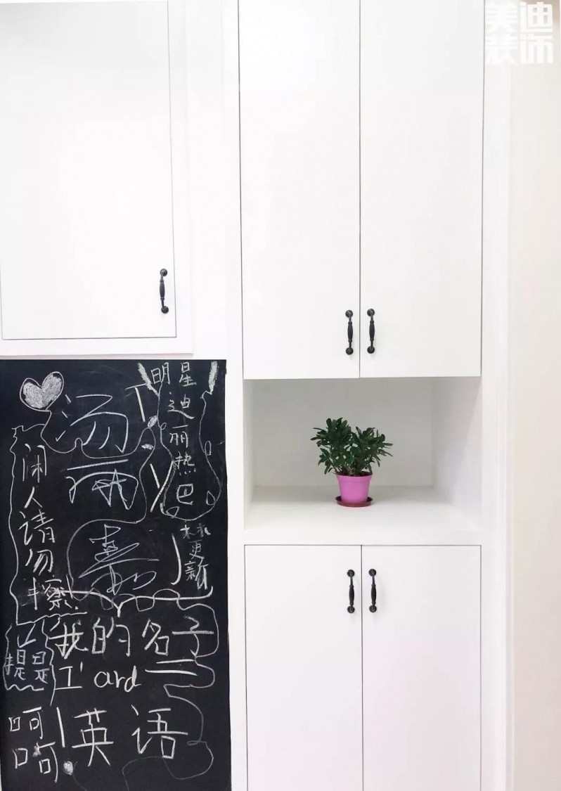 陽臺處為女兒設計的小黑板上畫滿了有趣的涂鴉,這是整個空間最隨意自由的一個部分。采訪的時候湯老師笑著說:"最喜歡小黑板,每天都能看到女兒不一樣的想法。"