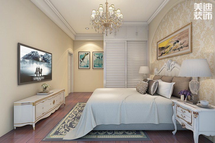 而對于床的位置并不靠墻的結(jié)構(gòu),床背景墻的另一面還可以延伸出來,成為另一個小空間,比如書桌臺、書桌,一物多用。