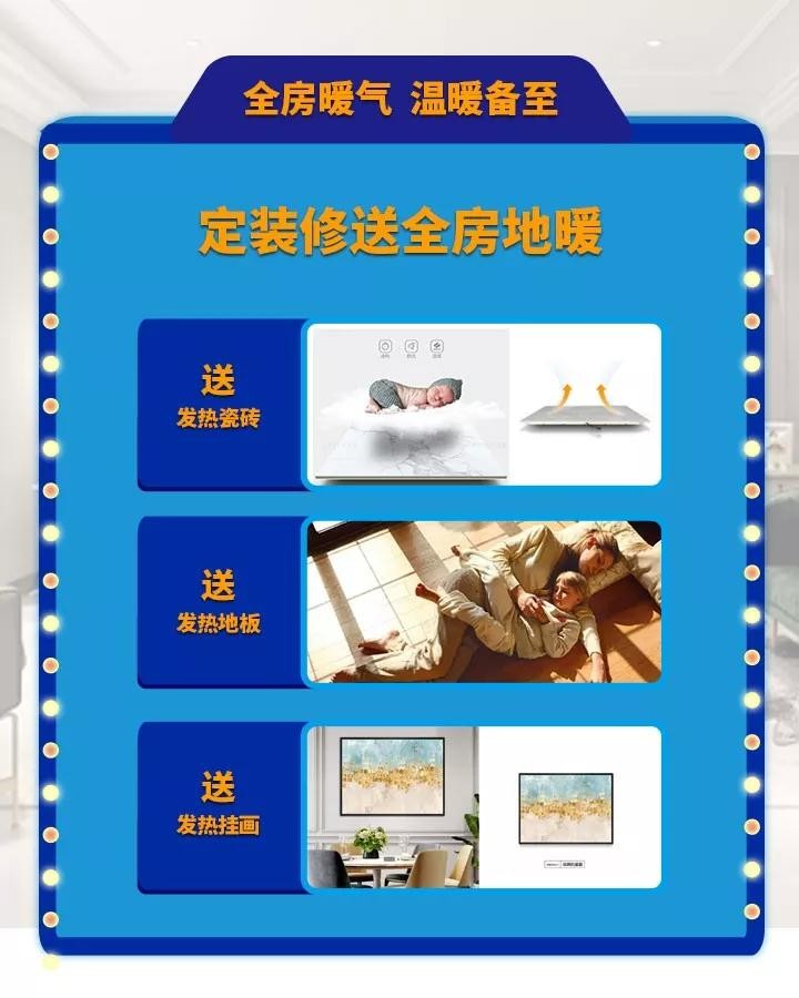 現(xiàn)在來美迪裝飾定裝修就送全房地暖:中央空調(diào)、地暖鍋爐、發(fā)熱瓷磚、發(fā)熱地板、取暖掛畫,讓您和家人告別寒冷,過一個(gè)溫暖的冬天。