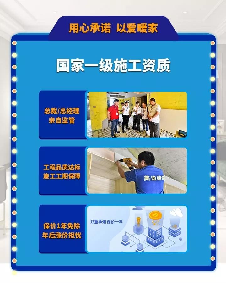 還在猶豫年前還是年后定裝修嗎?美迪裝飾鄭重承諾保價(jià)1年,用今年的價(jià)格裝明年的新家!更享總裁/總經(jīng)理親自監(jiān)管,確保工程品質(zhì)達(dá)標(biāo)、施工工期保障,裝修材料健康環(huán)保,層層把關(guān)品質(zhì)更高。