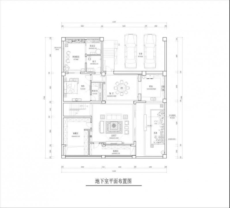 負(fù)一層:設(shè)計(jì)師完美的利用了地下室的空間,地下室空間變得通透又明亮,保留了原有建筑的天井下沉式庭院空間,營(yíng)造出有山有水的庭院小景,保證地下室陽(yáng)光和空氣的對(duì)流。藻井中9根假梁解決了樓層低的問(wèn)題。