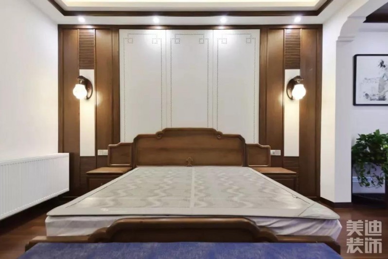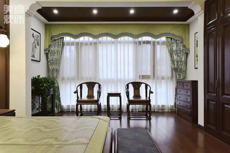 臥室的設(shè)計(jì)沒(méi)有過(guò)多的裝飾,實(shí)木地板、明清家具給臥室增添了幾分古色古香,豆綠色窗簾以及綠植點(diǎn)亮了整個(gè)空間,帶來(lái)活力。