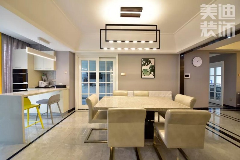 房主楊姐特別喜歡研究菜品,經(jīng)常在家做西點,追求精致的生活。設(shè)計師在設(shè)計中盡可能減少隔墻,弱化視覺阻礙的同時放大空間的通透性,從而使整體空間氛圍更加簡潔典雅。在色彩方面,采用對比色相搭配法,體現(xiàn)出空間的視覺焦點,彰顯活力。