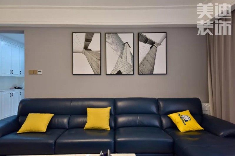 整個空間調(diào)性以灰色為主,凸顯空間質(zhì)感,沉靜的深藍色皮質(zhì)沙發(fā)與活潑黃色調(diào)的枕頭點綴使空間亮了起來。