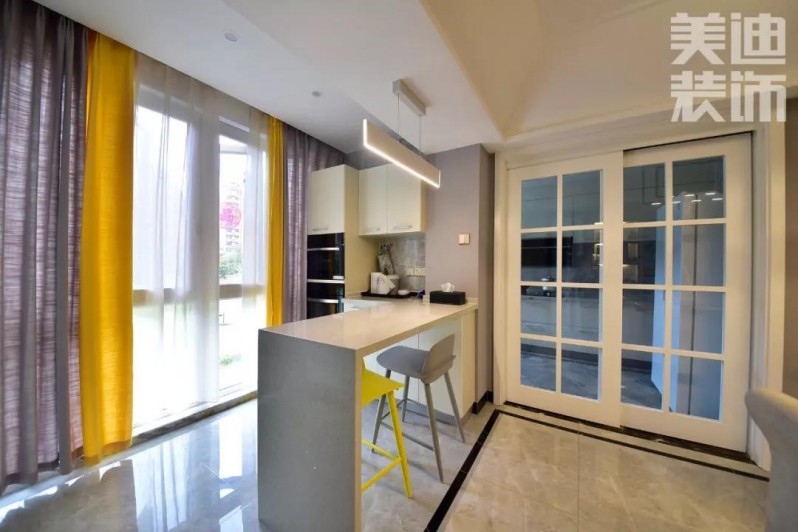 設(shè)計師根據(jù)業(yè)主個性需求,打造了一個客廳、餐廳、吧臺三位一體的空間,吧臺旁邊是柜子和微波爐,方便業(yè)主平時制作西點,一家人在此品味精美的西點,感受生活中的小情調(diào)。