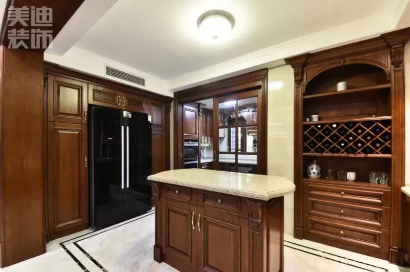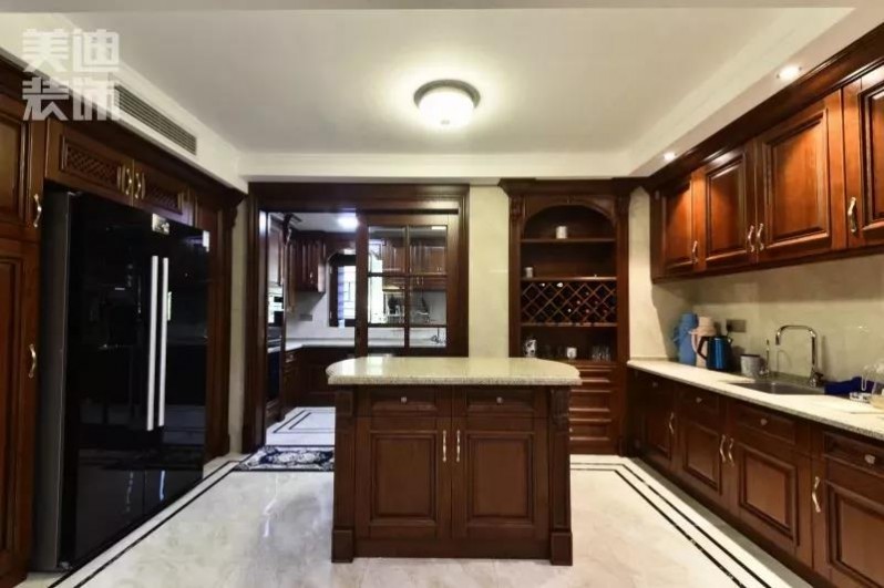 廚房和茶水之間利用茶水間進(jìn)行隔斷,既滿足了業(yè)主大家庭的儲(chǔ)物需求實(shí)用性,又使得空間通透明亮。