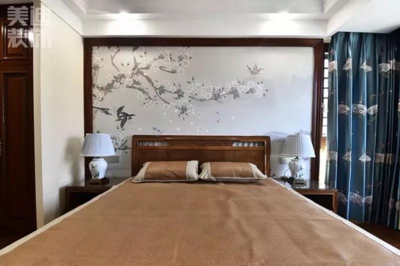 主臥的設(shè)計(jì)簡約、大氣,沉穩(wěn)的紅木家具床搭配床頭具有中國風(fēng)的梅花畫屏、簡約歐式溫馨臺(tái)燈,帶來優(yōu)雅復(fù)古的居住環(huán)境,同時(shí)梅花圖代表的是吉祥、幸福的意思。