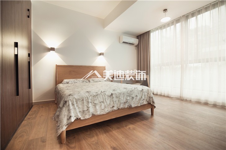 主臥清新淡雅,木質(zhì)床頭柜以及背景板,符合整體環(huán)境的風格,帶著清新氣息?;疑拇采嫌闷?,也是淡淡的小清新色調(diào)。