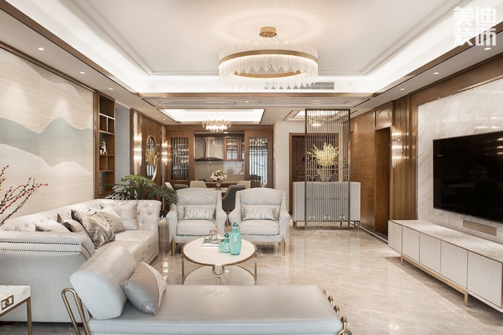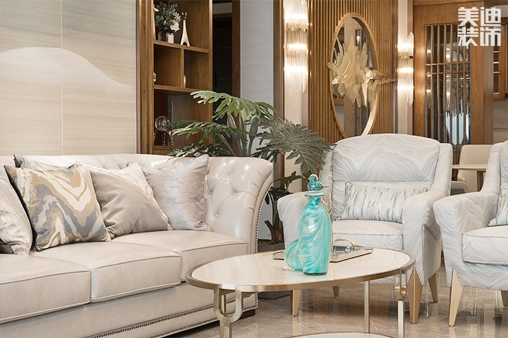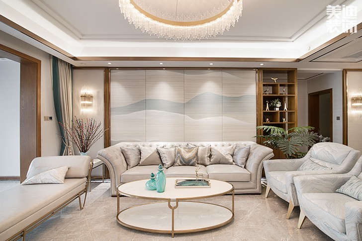 新中式風(fēng)格客廳,用大理石演繹了一幅水墨畫,給客廳平添一份精彩,地面大理石瓷磚讓整體更顯高端。
