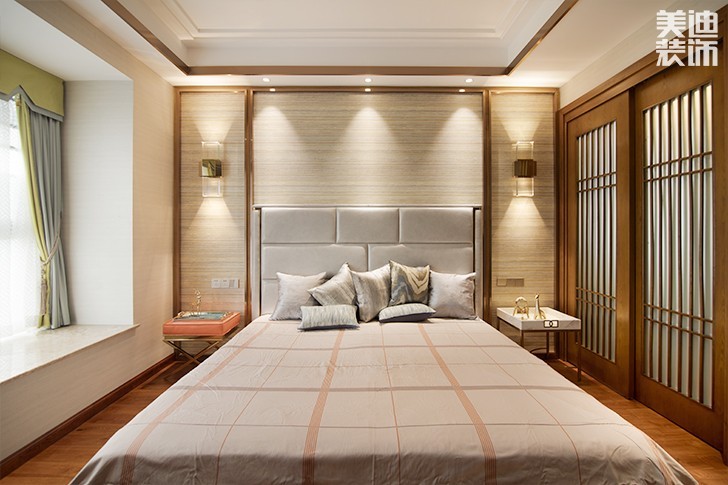 主臥的設(shè)計(jì)主要集中在床頭背景墻那塊,設(shè)計(jì)師采用了淺藍(lán)色的條紋,給臥室增加光彩,落地窗的設(shè)計(jì)直通陽臺(tái)。