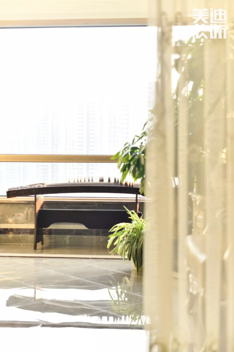 陽(yáng)臺(tái)上擺著一架古箏,文藝的氛圍油然而生。女主人江老師教了很多年古箏,還有不少學(xué)生在當(dāng)老師呢。