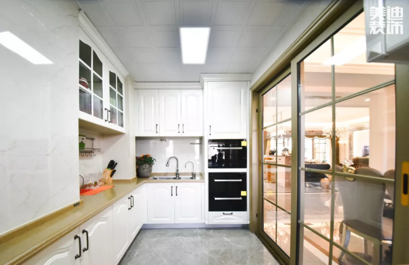 廚房空間以白色為主色調(diào),再搭配上金屬邊框的玻璃推拉門,簡(jiǎn)約又時(shí)尚。