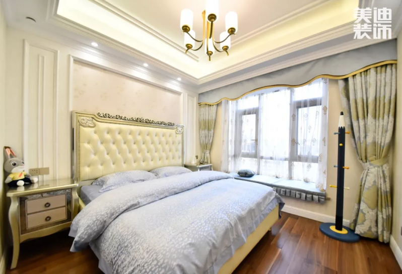 主臥從地面到家具再到軟裝,色彩層次豐富,家具保留了美式的尊貴復(fù)古味道,軟裝清新舒適。