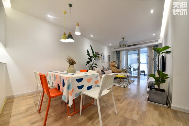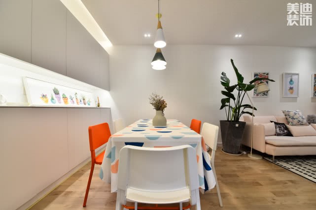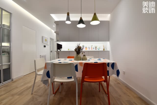 餐廳正對(duì)著廚房,活動(dòng)線流暢,每天做完飯后即可享受美味。撞色設(shè)計(jì)的餐椅在餐廳整面白墻中凸顯出來(lái),簡(jiǎn)約又時(shí)尚。頂部的吊燈光線剛好,主人用餐時(shí)想必也會(huì)身心愉悅。