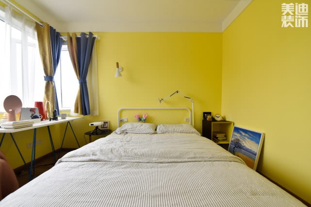 臥室墻面采用大面積鵝黃色,頂部的白色墻面與鵝黃色形成互補(bǔ),讓原本過(guò)多的黃色卻又顯得剛好。拼接的窗簾時(shí)尚感滿滿,臨窗設(shè)置的書桌光線十足。在某個(gè)周末,要是陽(yáng)光明媚便拉開窗簾,讓陽(yáng)光透漏進(jìn)來(lái),在書中探索人生,要是下著雨便拉上窗簾,縮在被子里打游戲也是一種樂趣。