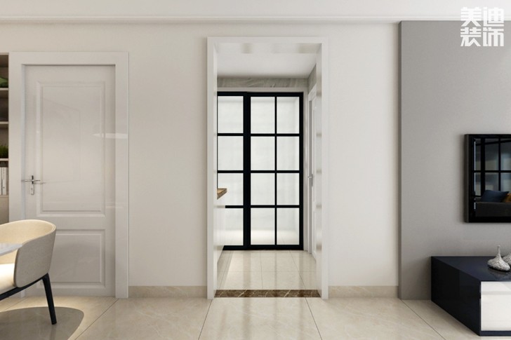 客廳空間運用了大量的淺色調(diào),避免產(chǎn)生沉悶壓抑的感覺。客廳的窗戶不大,大量的白色,也讓空間看上去更加通透明亮一些。戶型的布局把動靜區(qū)區(qū)隔開來,整個動區(qū)包含客廳、餐廳、廚房僅僅依靠陽臺的采光就足夠的明亮通透。其中客廳選用白色沙發(fā)依墻而設(shè),與白色為主色,黑色為輔色的電視一體柜搭配簡單純凈,在裝飾上搭配黑色、藍色的裝飾畫,色彩對比強烈。沙發(fā)與窗簾選擇了不同深淺的灰色,加上抱枕與裝飾畫的點綴,簡約且有層次感,舒適不失精致感。