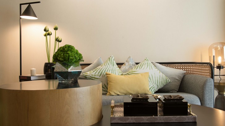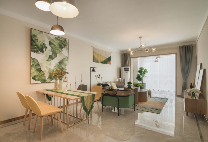 客廳利用淺色地磚和白色天花板作為背景色,而墻面、電視墻和沙發(fā)家具則利用各種綠色和嫩黃色作為主色調(diào),渲染一副清新的美好畫面。