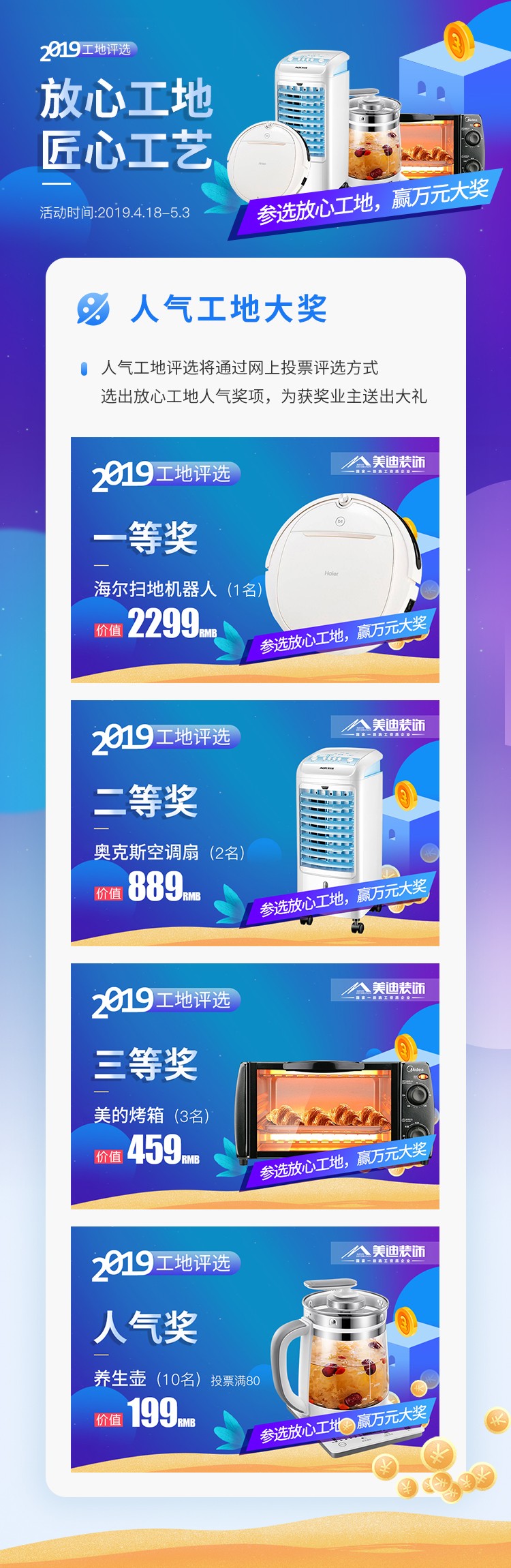 我們希望通過工地展示和評(píng)選的方式,喊大家一起來監(jiān)督美迪品質(zhì)工程啦!同時(shí)為感謝業(yè)主的放心選擇,參選放心工地投票,還能贏大獎(jiǎng)呀!