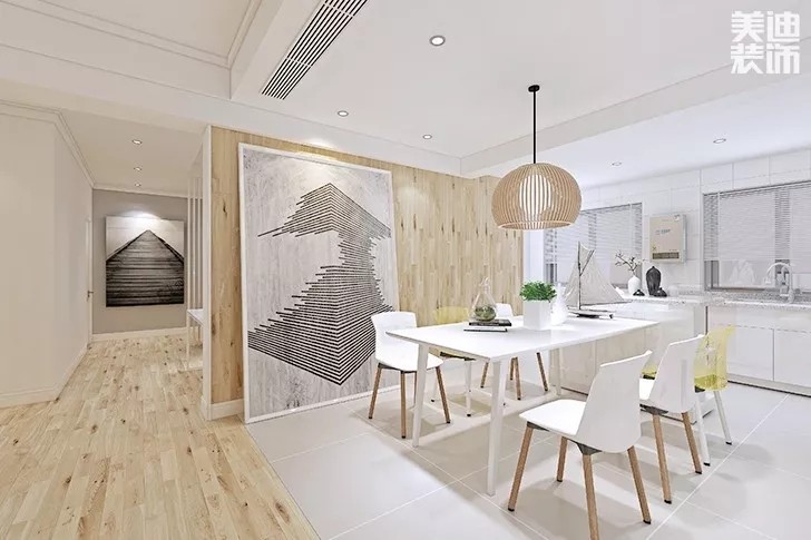 在公共區(qū)域的地面,玄關(guān)和廚房均使用瓷磚,而客廳、餐廳、臥室則使用原木地板,這樣的過(guò)渡方式,讓各個(gè)空間之間的區(qū)隔顯得更加自如。
