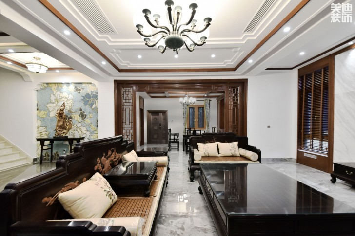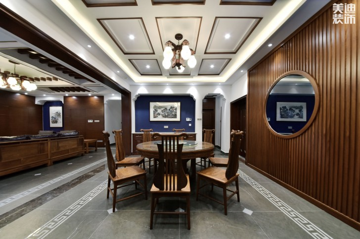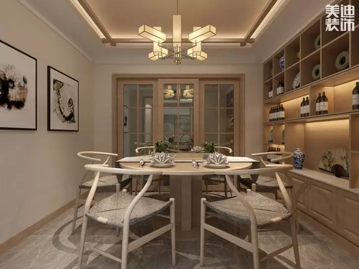 這套案例中周港設(shè)計(jì)師對空間對稱的結(jié)構(gòu)、材質(zhì)的運(yùn)用及軟裝陳列方式,都體現(xiàn)出中式的韻味與儀式感。其中建筑都是木質(zhì)結(jié)構(gòu),柔和的燈光,精致的壁畫,中式的壁櫥,使整個(gè)居室在濃濃古韻中滲透幾許現(xiàn)代氣息。