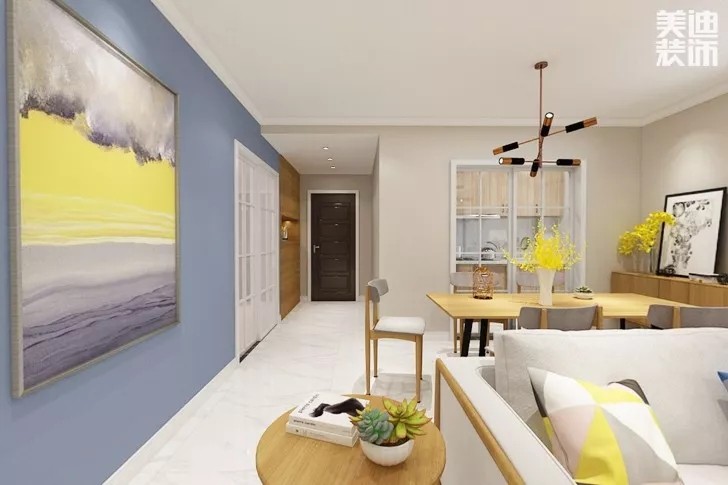 溫馨格調(diào)的餐客廳裝修,客廳與餐廳中間是一個比較窄的走廊,餐廳裝修也是十分的雅致文藝,搭配的是原木色餐桌椅。