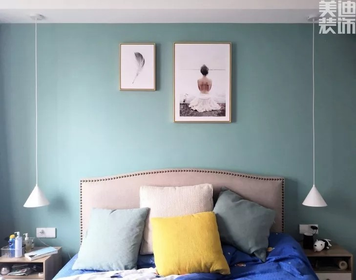 臥室的設計整體就比較的溫馨了,是按照我愛人的要求,以暖色調(diào)為主,墻面刷成藍綠色,在搭配相應的軟裝,配色統(tǒng)一,視覺效果好。