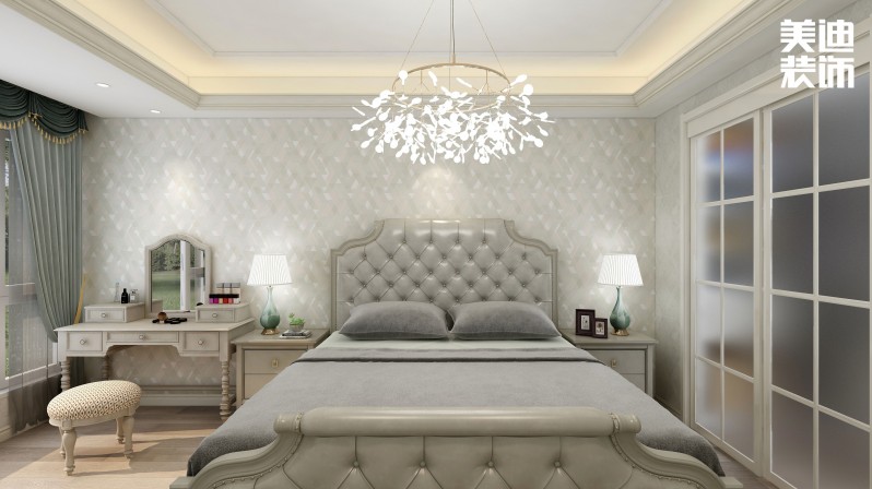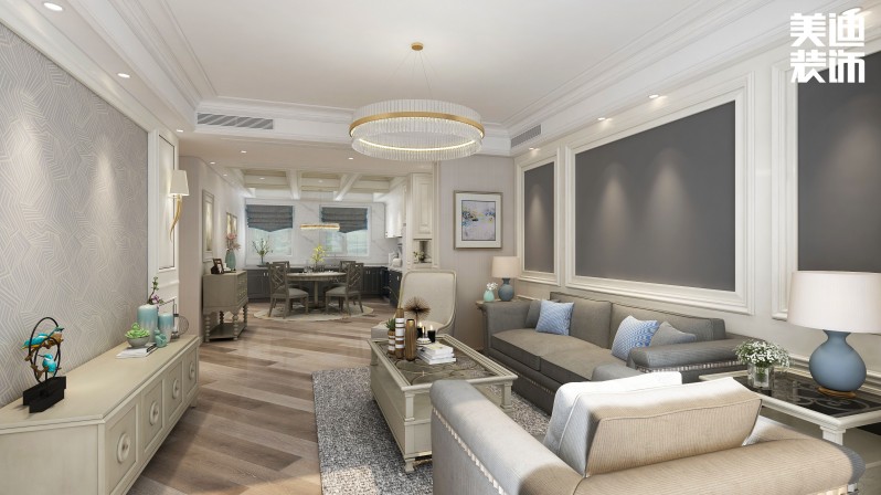 白色、灰藍(lán)色背景墻的簡(jiǎn)約柔和與淺灰色家具相得益彰,產(chǎn)生恰到好處的舒適度,龍思洛設(shè)計(jì)師在色彩搭配上極其巧妙,灰藍(lán)系適中的色彩調(diào)性散發(fā)優(yōu)雅酷感的空間氣質(zhì),再加水晶吊燈渲染,盡顯奢華。