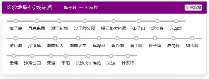 4號(hào)線一期工程全長(zhǎng)33.5公里,設(shè)25座車(chē)站,均為地下車(chē)站,是繼2號(hào)線、1號(hào)線、長(zhǎng)沙磁浮快線之后開(kāi)通的又一條骨干線路。由西至東站點(diǎn)分別有: