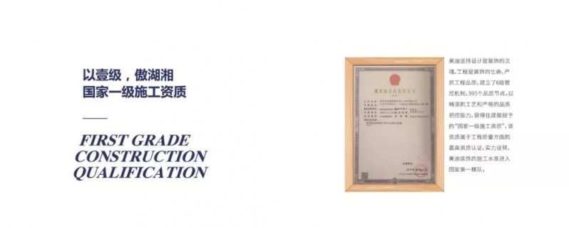 美迪裝飾擁有國(guó)家一級(jí)施工資質(zhì)的裝飾企業(yè),追求高質(zhì)量工藝,對(duì)待每一個(gè)工地都做到“防滲漏、防開(kāi)裂、防干擾、防污染”,獲得“全國(guó)無(wú)甲醛環(huán)保裝修示范單位”、“中國(guó)家裝行業(yè)二十年設(shè)計(jì)機(jī)構(gòu)十強(qiáng)企業(yè)”“湖南十佳樣板工地企業(yè)”等榮譽(yù)稱號(hào)。