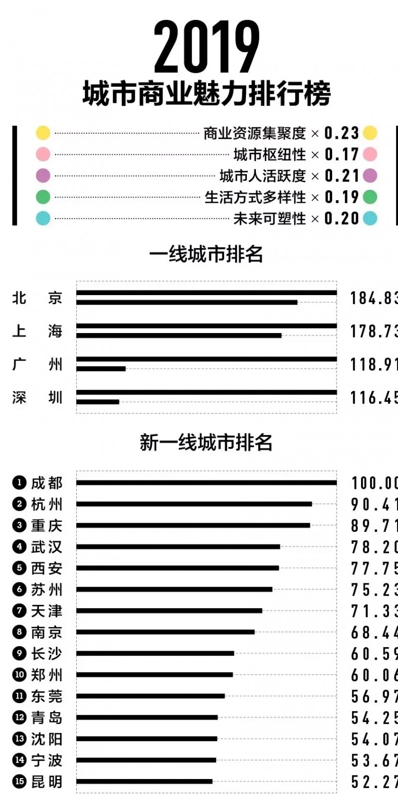 根據(jù)榜單,一線城市的座次從去年的“上北深廣”重歸“北上廣深”。2019年,15座新一線城市依次為成都、杭州、重慶、武漢、西安、蘇州、天津、南京、長(zhǎng)沙、鄭州、東莞、青島、沈陽(yáng)、寧波、昆明。前四名城市排名相對(duì)穩(wěn)定,長(zhǎng)沙排名較去年上升一位。