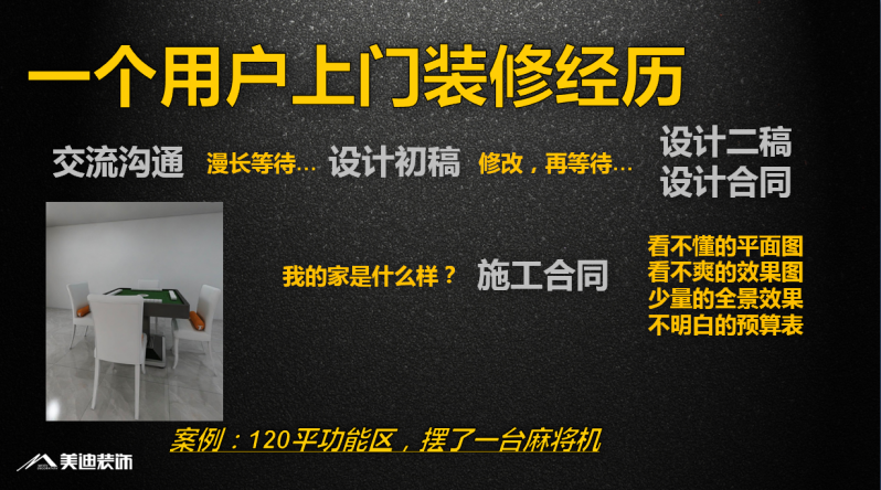 傳統(tǒng)模式裝修的各個(gè)環(huán)節(jié),比如設(shè)計(jì)、預(yù)算、材料、軟裝等都是割裂分開的,導(dǎo)致信息錯(cuò)位、管理混亂、耗時(shí)費(fèi)力,而美迪全房全景模式本質(zhì)上是通過設(shè)計(jì)將裝修全程集中管理,設(shè)計(jì)是基于業(yè)主的真實(shí)需求、預(yù)算和材料等,更可控,消費(fèi)更透明。