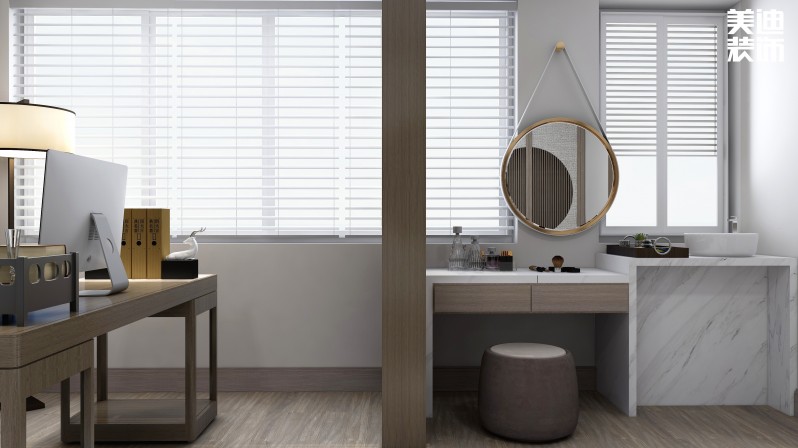 主臥的空間非常舒適,采用了偏淺的原木色作為主色調(diào),在書房與梳洗區(qū)的置物架起到隔斷與分離兩個(gè)空間的作用,衛(wèi)生間采用的是分離式設(shè)計(jì),對(duì)衛(wèi)浴空間的功能使用做到了最大化。