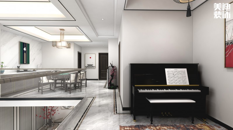 客廳背景墻采用大面積的大理石紋路,使人產(chǎn)生一種墨溶于水,水墨交融的淡雅禪韻。地面以波打線劃分出餐廳,吊頂則是簡(jiǎn)單的回型燈槽吊頂,加上兩圈黑鈦線條,讓地面和頂面形成一個(gè)呼應(yīng),使餐廳形成一個(gè)獨(dú)立的區(qū)域。
