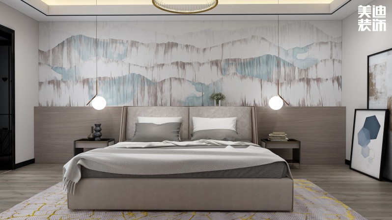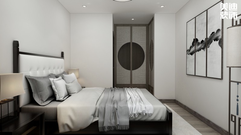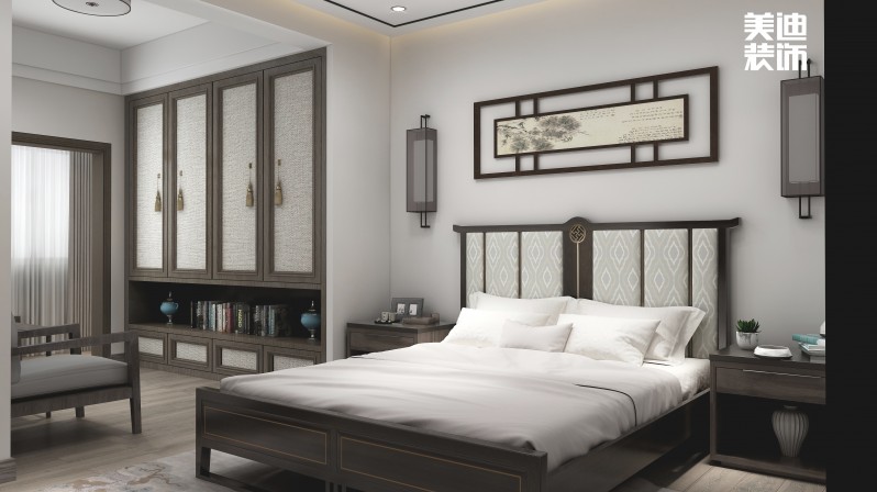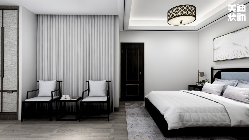 臥室區(qū)使用島式燈槽吊頂劃分臥室與休閑區(qū)的關(guān)系,老人房和客房的設(shè)計(jì)用咖啡色、原木色等看起來(lái)柔和、樸素寧?kù)o的色調(diào),不僅十分的舒適,還讓人感到平和寧?kù)o。
