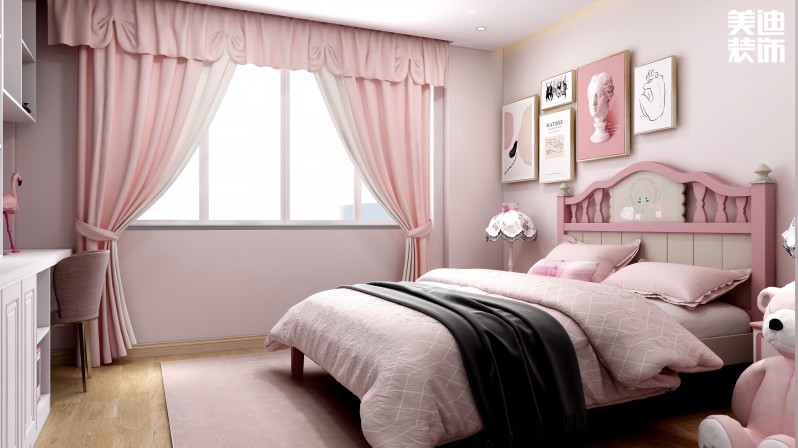 女孩房整個(gè)空間用的是粉色系,滿足小女孩的公主夢(mèng),這種夢(mèng)幻風(fēng)格的格局透露出來(lái)的小清新氣息讓人心情舒暢,更顯得天真、可愛(ài)、純真。