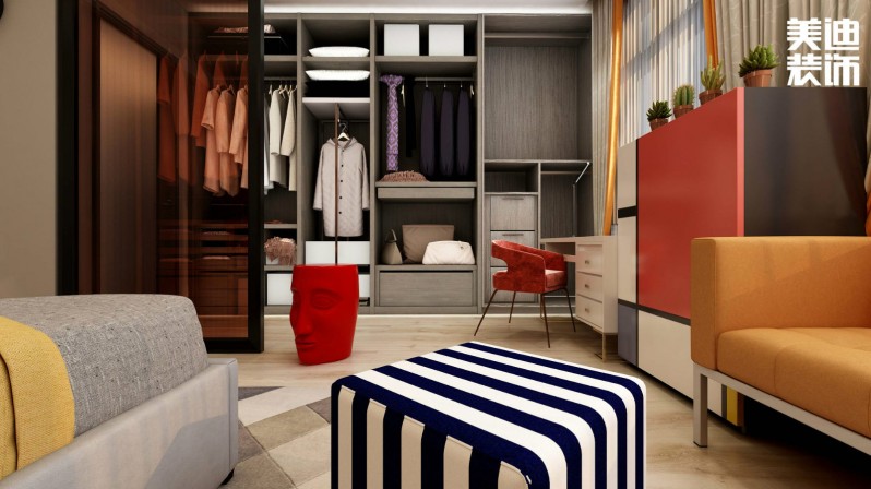 整個(gè)客餐廳采用四種比較碰撞的色調(diào)進(jìn)行了一場(chǎng)混搭。紅、藍(lán)、綠、橙,設(shè)計(jì)上沒(méi)有采用過(guò)多的復(fù)雜造型。因?yàn)閴γ骖伾容^厚重,所以木地板選擇比較清新自然的原木色。