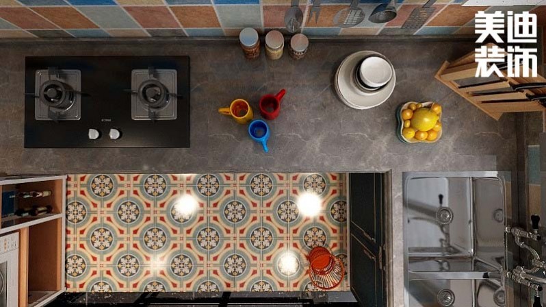 廚房的地磚和墻磚色彩都比較豐富。為了和客餐廳形成統(tǒng)一的關(guān)系,色彩上面與整體設(shè)計(jì)形成了呼應(yīng)。櫥柜方面采用墨綠色搭配白色的,柜門上鑲有金邊,充滿了復(fù)古感。