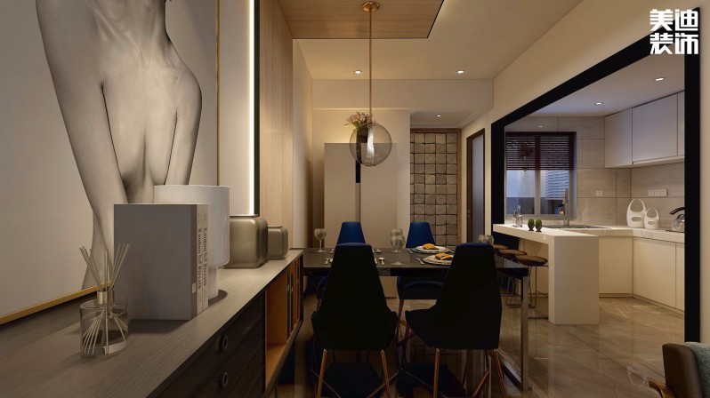 將金屬、玻璃的元素作為輔材裝飾,是現(xiàn)代風(fēng)格的常見裝飾手法,能給人帶來前衛(wèi)、不受拘束的感覺。而香檳色的金屬更具高級感,完美契合輕奢調(diào)性。李曌曦設(shè)計(jì)師的這套作品打破了整體空間的線條感,以動制靜充滿朝氣,而且時尚靈動。
