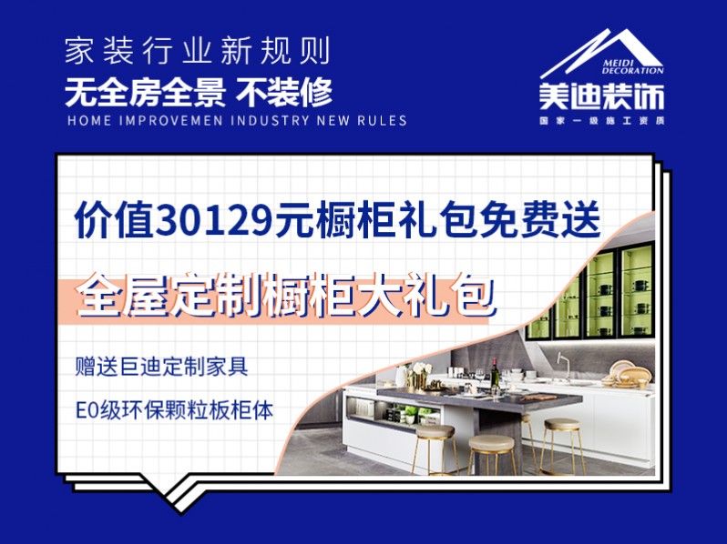 家裝行業(yè)新規(guī)則,無全房全景不裝修。價(jià)值30129元櫥柜禮包免費(fèi)送,全屋定制櫥柜大禮包,贈送巨迪定制家具,E0級環(huán)保顆粒板柜體。