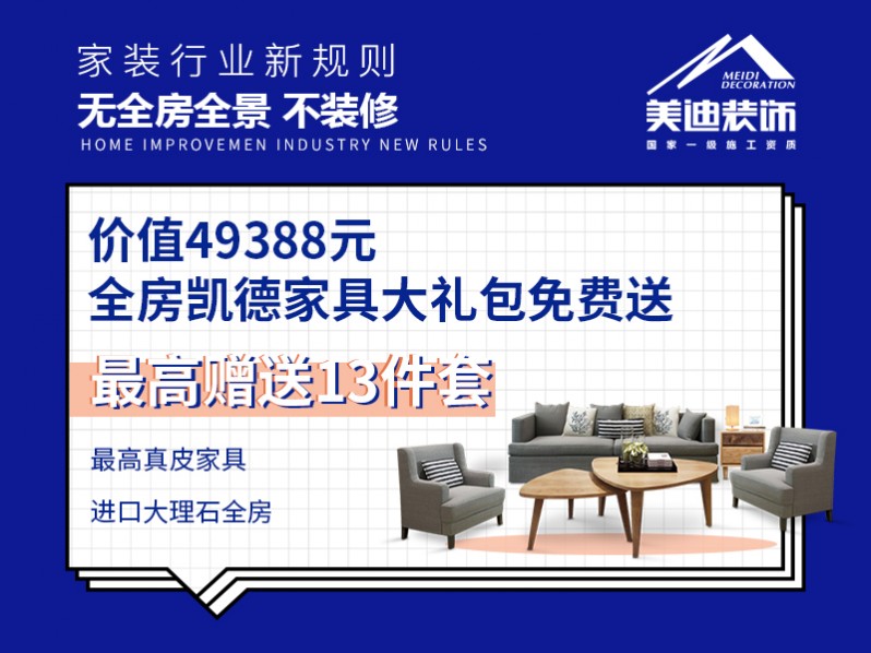 家裝行業(yè)新規(guī)則,無全房全景不裝修。價(jià)值49388元,全房凱德家具大禮包免費(fèi)送,最高贈送13件套。