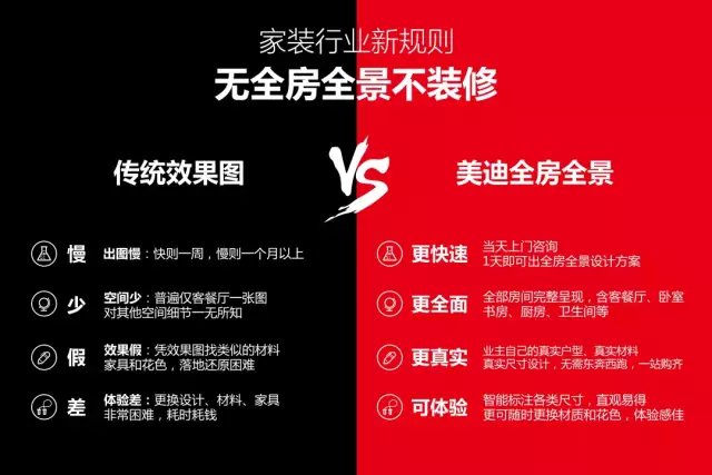 美迪裝飾“家裝行業(yè)新規(guī)則,無全房全景不裝修”活動全面啟動?;谔摂M現(xiàn)實(shí)技術(shù),將傳統(tǒng)的平面呈現(xiàn)方式轉(zhuǎn)變?yōu)榱Ⅲw全景式,帶來沉浸式視覺體驗(yàn),借助VR技術(shù),還可實(shí)現(xiàn)“身臨其境未來家”使用體驗(yàn)。